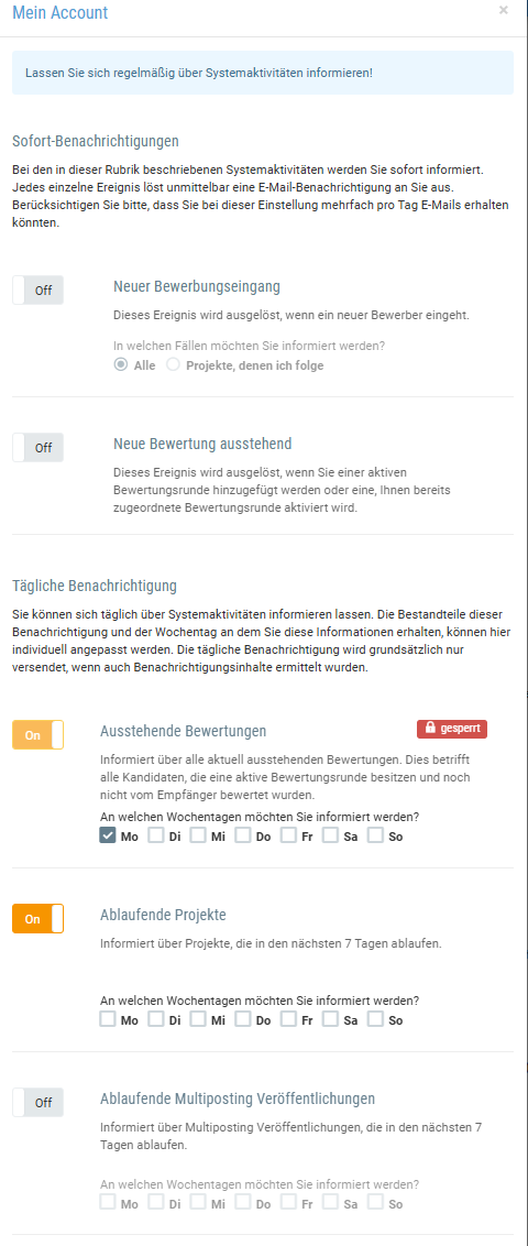 - Ablaufende Projekte: Sie erhalten sieben Tage vor Ablauf eines Projekts (z. B. dem Ende einer Ausschreibung) eine Erinnerungsnachricht.